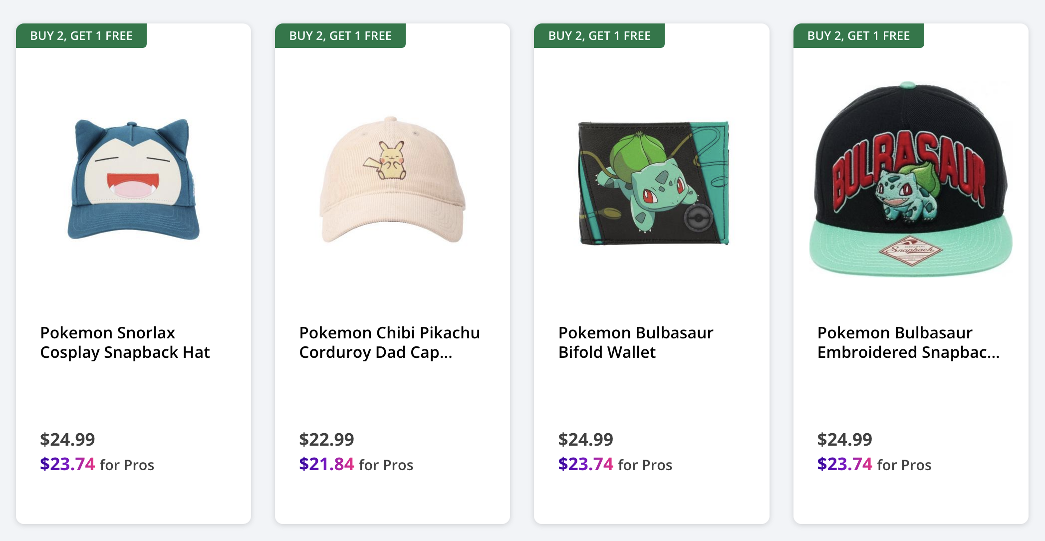 GameStop has a LARGE collection of Pokémon merch. From hats to bags to clothing and jewelry, any Pokémon fan is bound to find something that tickles their fancy. To sweeten the deal, they currently have a “Buy 2, Get 1 Free” deal on all of their Pokémon products. Their products are a good mix of softer, feminine designs, as well as bolder, masculine designs.